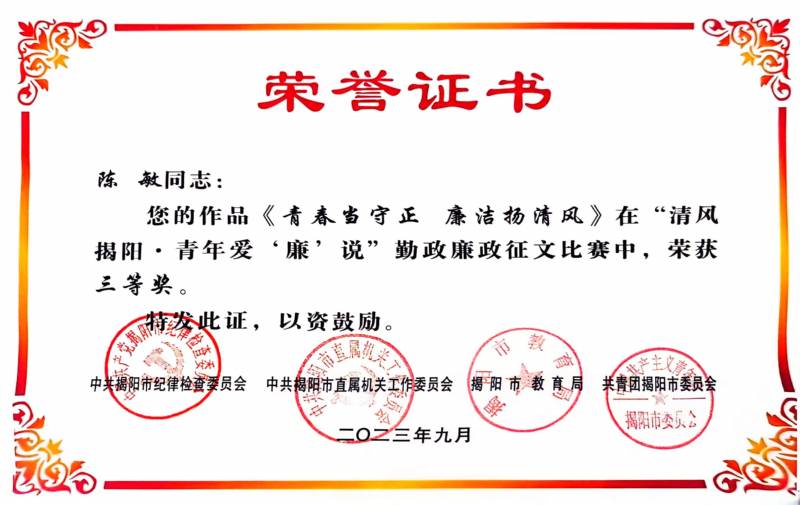 陈敏同志荣获“清风揭阳·青年爱‘廉’说”勤政廉政征文比赛三等奖